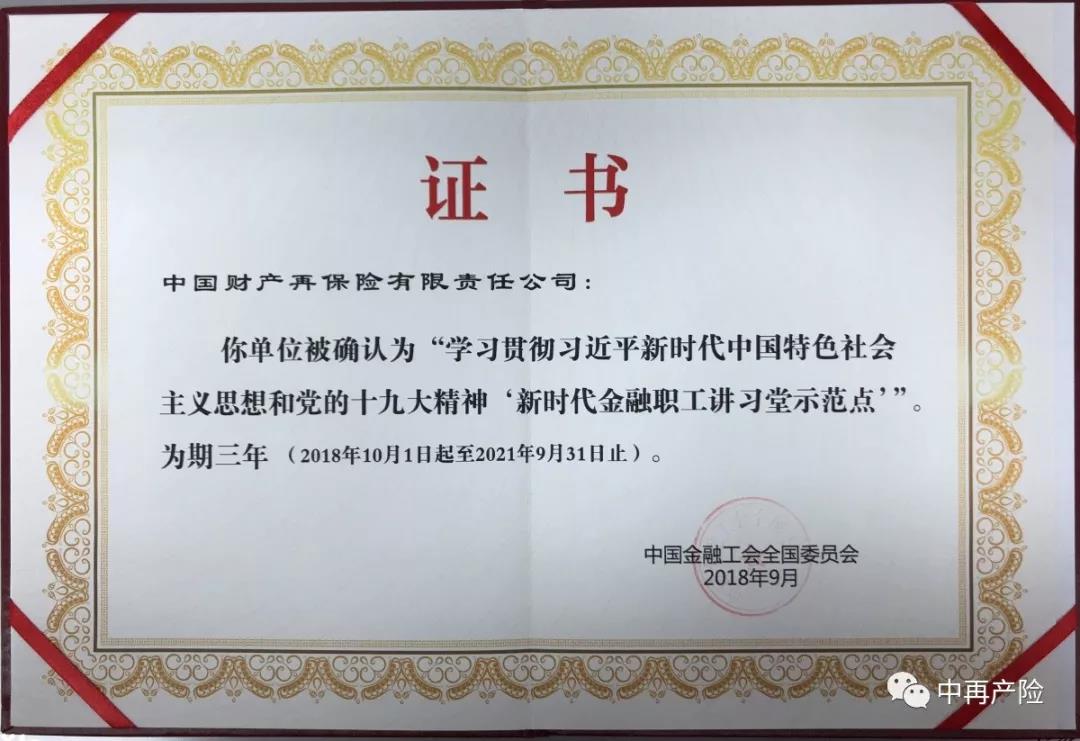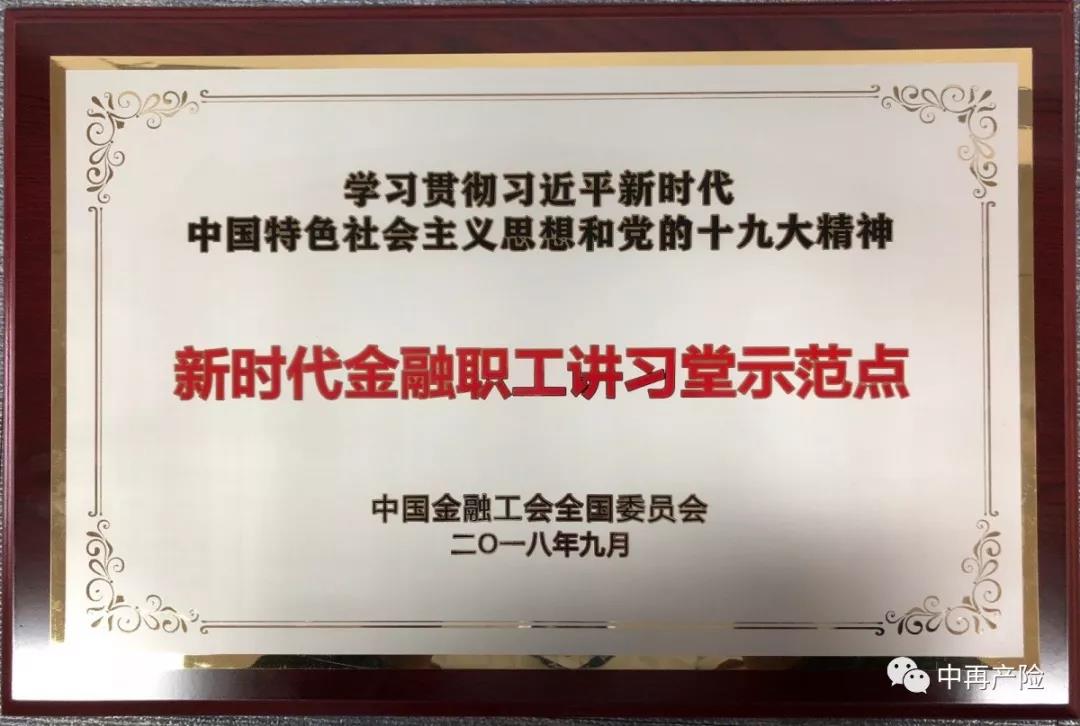 近日, 在中国金融工会组织的“学习贯彻习近平新时代中国特色社会主义思想和党的十九大精神‘新时代金融职工讲习堂示范点’”创建活动中,由中再产险创办的“产再讲堂”被评为“新时代金融职工讲习堂示范点”之一。