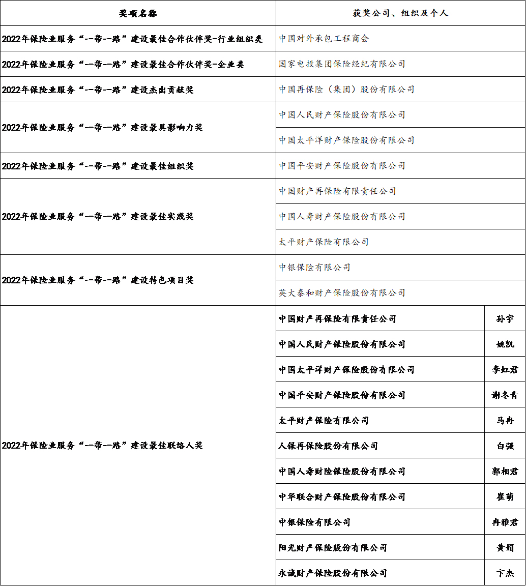 2022年,“一带一路”共同体成员公司主动担当,为中国海外利益(财产类)提供近3.3万亿元人民币的保险保障,同比增长19%。为表彰成员公司以及保险业实体经济合作伙伴对保险业服务“一带一路”建设所作出的贡献和支持,大会颁发多个奖项。